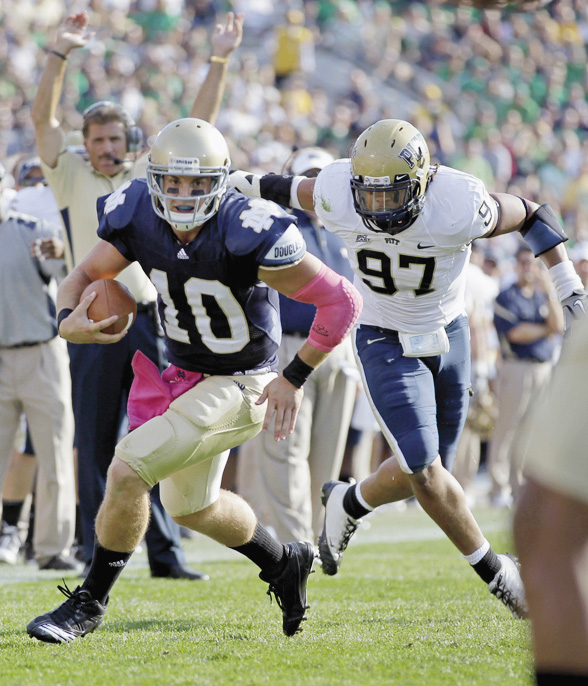 SOUTH BEND, Ind. (AP)—Brian Kelly’s baby, his spread offense, was clicking for a half. Notre Dame’s no-huddle was snapping off plays so rapidly that Pitt’s defense was hurrying to get organized. The speed early on was almost dizzying.