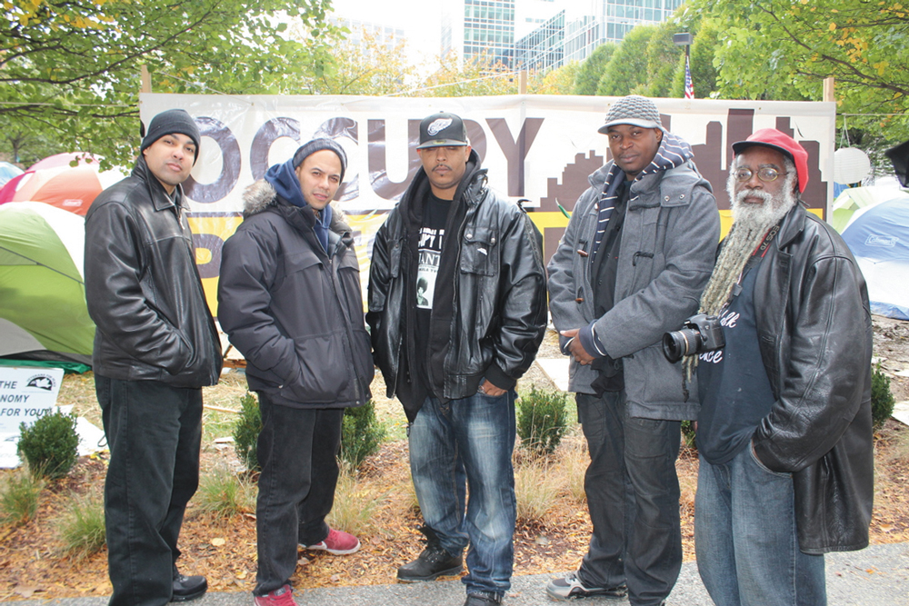 | UNITED WE STAND—Members of New York City’s Occupy The Hood movement Malik Rhasaan, Preach Daimond and “Rithm” George Martinez join Paradise Gray and Jasiri X at Mellon Green. (Photo by J.L. Martello)