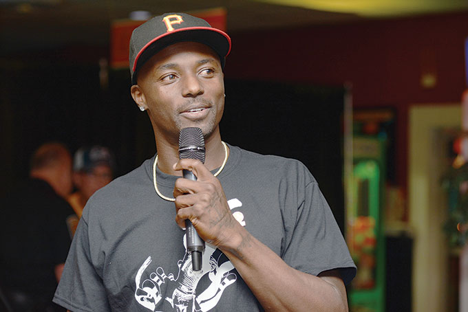 SANTONIO HOLMES, right, and Roosevelt Nix, left, were among the many Steelers and other celebrities at Holmes’ Strikes Against Sickle Cell Bowlathon, Oct. 10 at AMF Noble Manor Lanes on the West End. Holmes’ son, T.J., was diagnosed with Sickle Cell disease at birth. (Photo by Tationna Smalley)