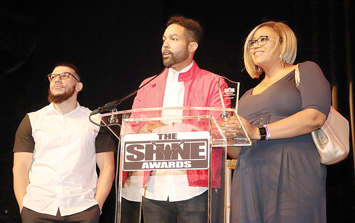 June 2 WAS A FESTIVE DAY in Downtown Pittsburgh, as numerous students received SHYNE Awards at the August Wilson African American Cultural Center. SHYNE stands for Show How Youth Need to Excel. The organization’s mission is to create public platforms to recognize the positive achievements of youth ages 13-19. Pictured is Movement Award recipient 1 Hood Media. (Photos by Courier photographer J.L. Martello)