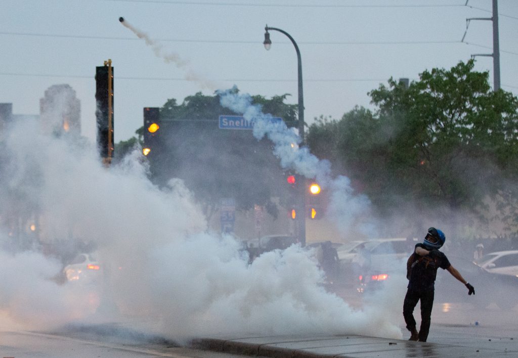 A protester throws a gas canister back at police during a protest over the killing of George Floyd in Minneapolis on May 26, 2020. (Chris Juhn/Zenger)