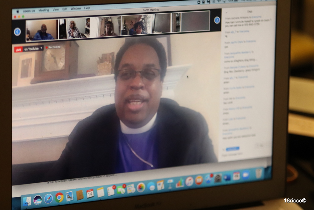 REV. JONATHON COUNTS, Pastor of Homewood AME Zion Church, communicating with conference attendees via the new normal, online. (Photos by Courier photographer J.L. Martello)