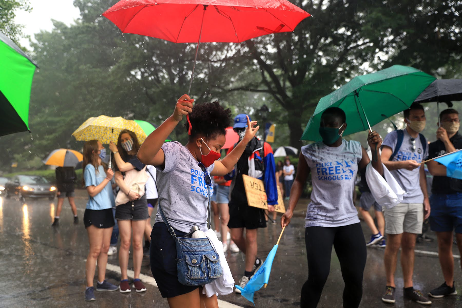 Demonstrators dance in spite of the rain storm during the protest in Oakland against police presence in schools (Photo by Jay Manning/PublicSource)