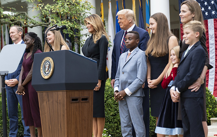 President Donald J. Trump and First Lady Melania Trump pose for a photo with Judge Amy Coney Barrett and her family members, all unmasked, after being announced as the President’s nominee for Associate Justice of the Supreme Court of the United States Saturday, Sept. 26, 2020, in the Rose Garden of the White House. (Official White House Photo by Shealah Craighead)