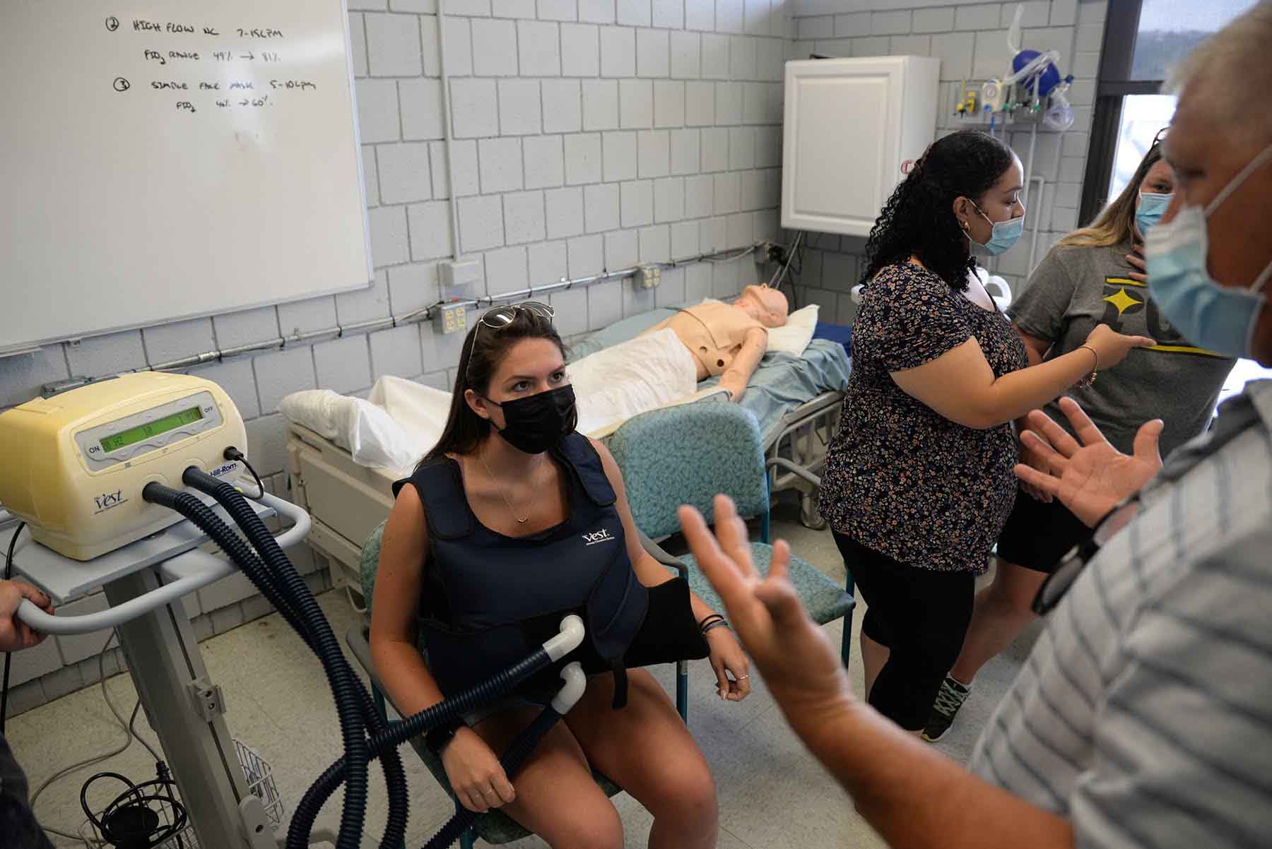 Amanda Antol, left, sits strapped to “The Vest” airway clearance system and talks to professor Jason Trautman during a respiratory therapy program class at the Community College of Allegheny County. (Photo by Clare Sheedy/PublicSource)