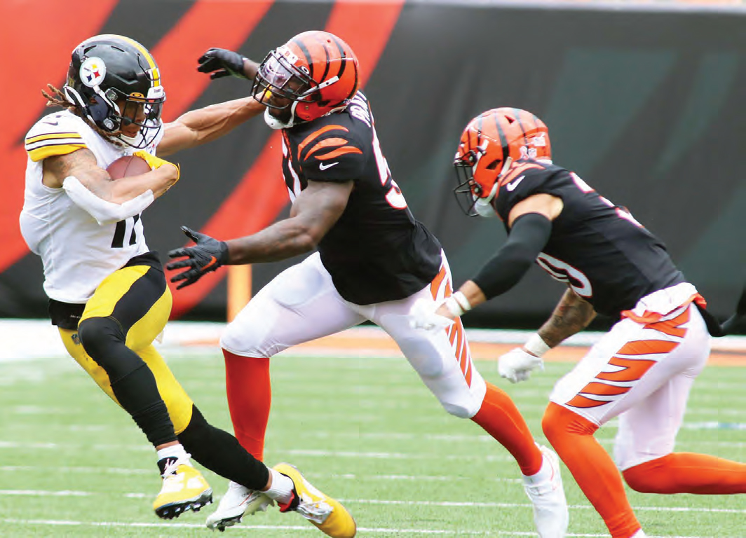 GET OFF ME!!! STEELERS RECEIVER CHASE CLAYPOOL eludes Bengals linebacker Germaine Pratt in Pittsburgh’s 23-20 overtime win in Cincinnati, Sept. 11. (Photo by Courier photographer Mike Patton)