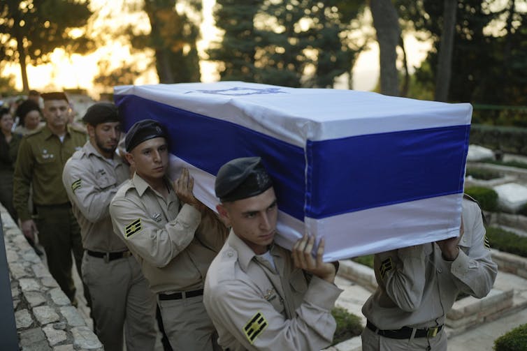 Israeli Navy sailors carry the flag-draped coffin of Petty Officer 1st Class David Moshe Ben Shitrit, who was killed in the Hezbollah attack on Israel on Sunday. Ohad Zwigenberg/AP
