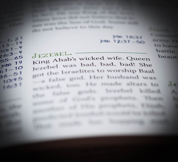 Different versions of Jezebel are found in the Old and New Testaments, but both are associated with power, independence and sexuality. In 1 Kings, Jezebel is a queen from Sidon (present-day Lebanon). She ruled along with her husband Ahab and refuses to worship the biblical God; she continued her traditional worship of Ba’al.