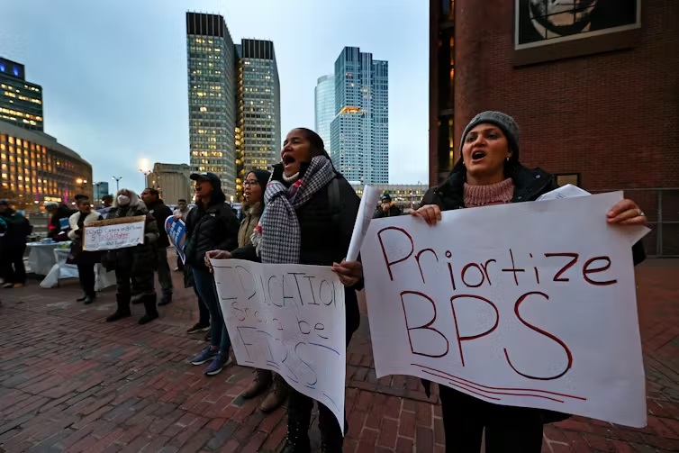 Parents and educators rally at Boston City Hall demanding urgent action to improve the city’s public schools. Barry Chin/The Boston Globe via Getty Images