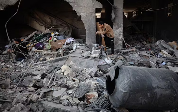 Buildings and a ceasefire left in ruins after airstrikes on March 18, 2025. Majdi Fathi/NurPhoto via Getty Images