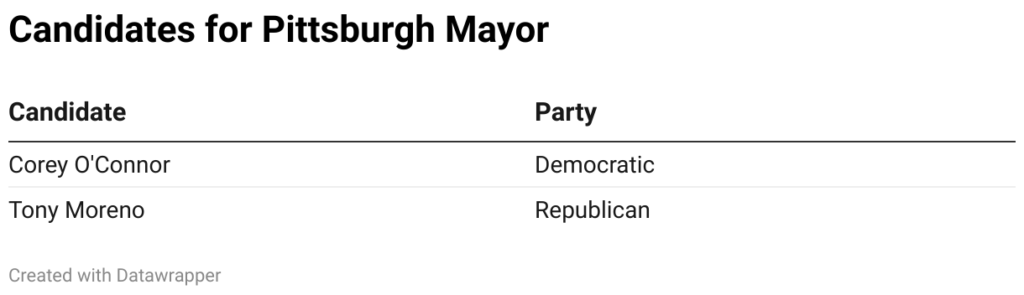 Pittsburgh voters will elect a new mayor this year, deciding between Democratic nominee Corey O’Connor and Republican nominee Tony Moreno. More than half of Allegheny County Council seats are on the ballot, along with five of nine Pittsburgh Public Schools seats and four of nine Pittsburgh City Council seats.