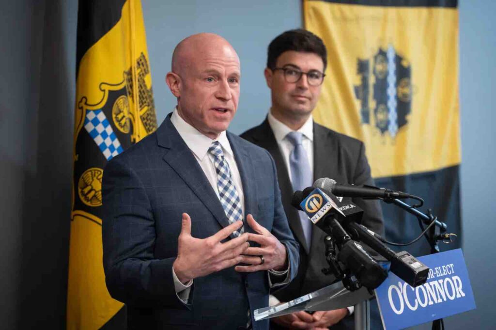 Jason Lando, left, speaks at a press conference with Corey O’Connor, right, Pittsburgh mayor-elect on Nov. 13, at the mayor-elect’s transition office in Downtown. Lando is O’Connor’s nominee for chief of the Bureau of Police. (Photo by Stephanie Strasburg/Pittsburgh’s Public Source)